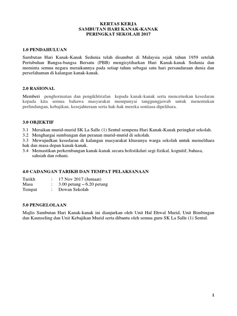 PENDAHULUAN Sambutan Hari Kanak-kanak Sedunia telah disambut di Malaysia sejak tahun 1959 setelah Pertubuhan Bangsa-bangsa Bersatu PBB mengistiharkan Hari Kanak-kanak Sedunia dan meminta semua negara meraikannya setiap tahun sebagai. Kertas Cadangan Jogathon 2. Embed KERTAS KERJA HARI ASRAMA TERBUKA 2015 bil 2docx.